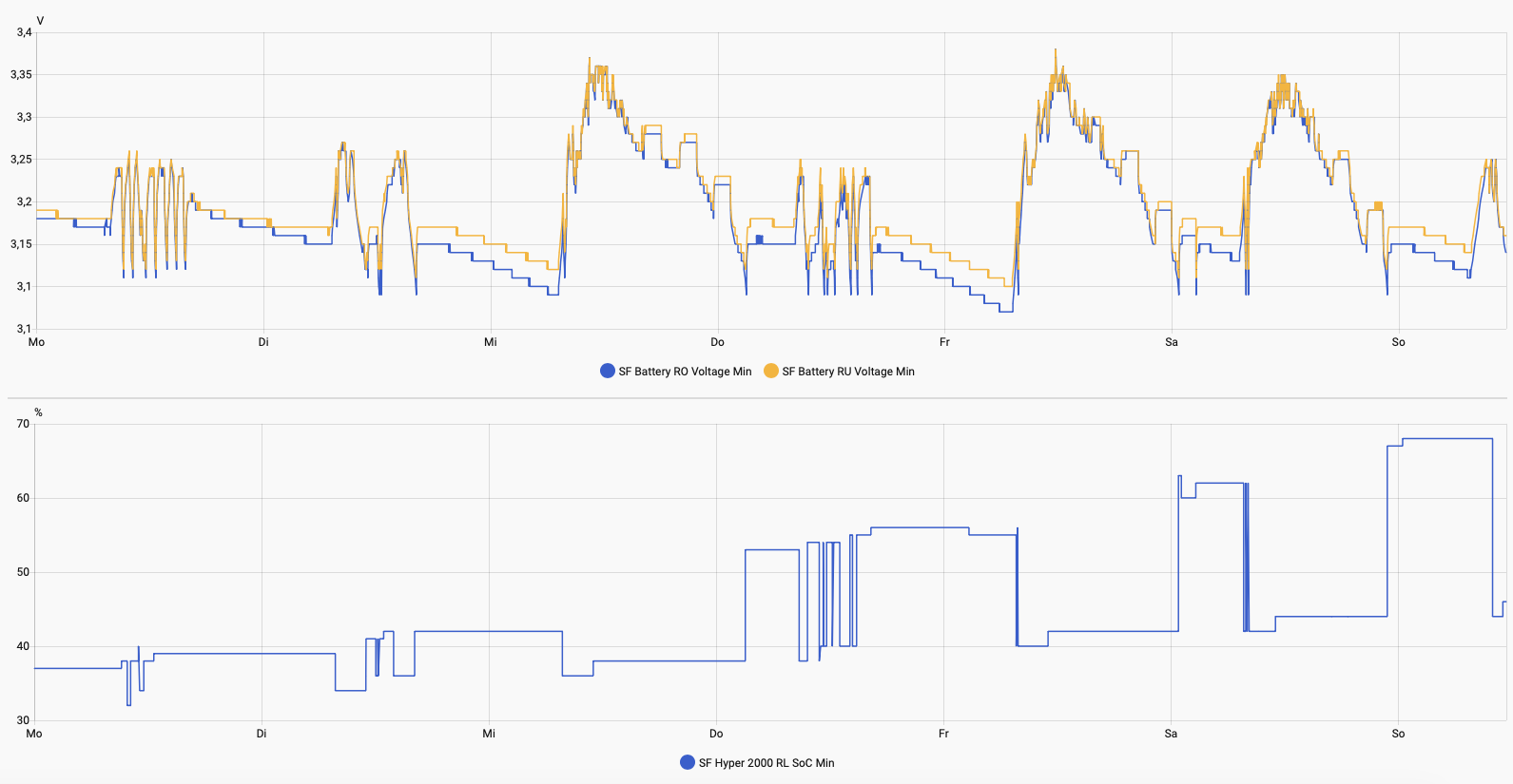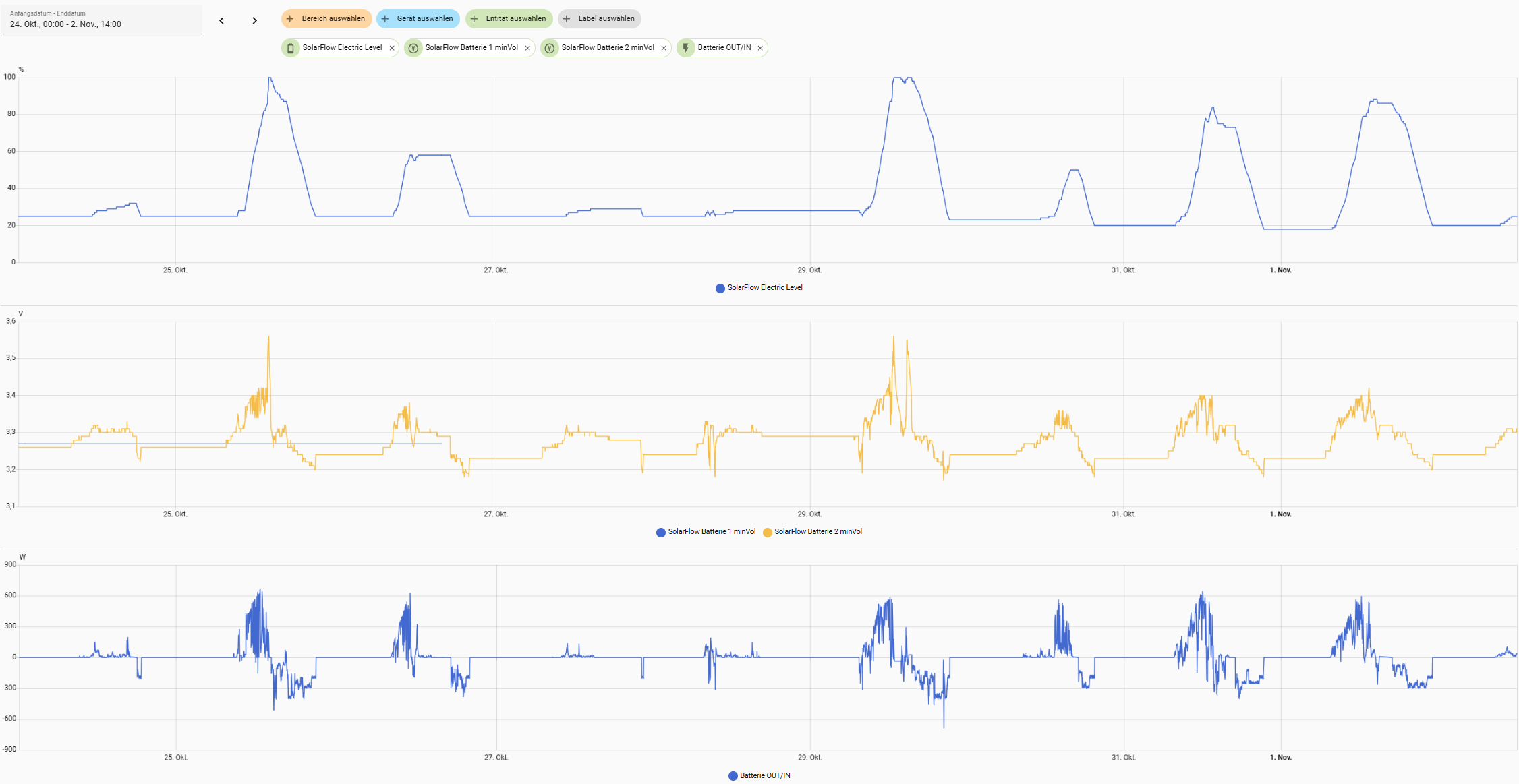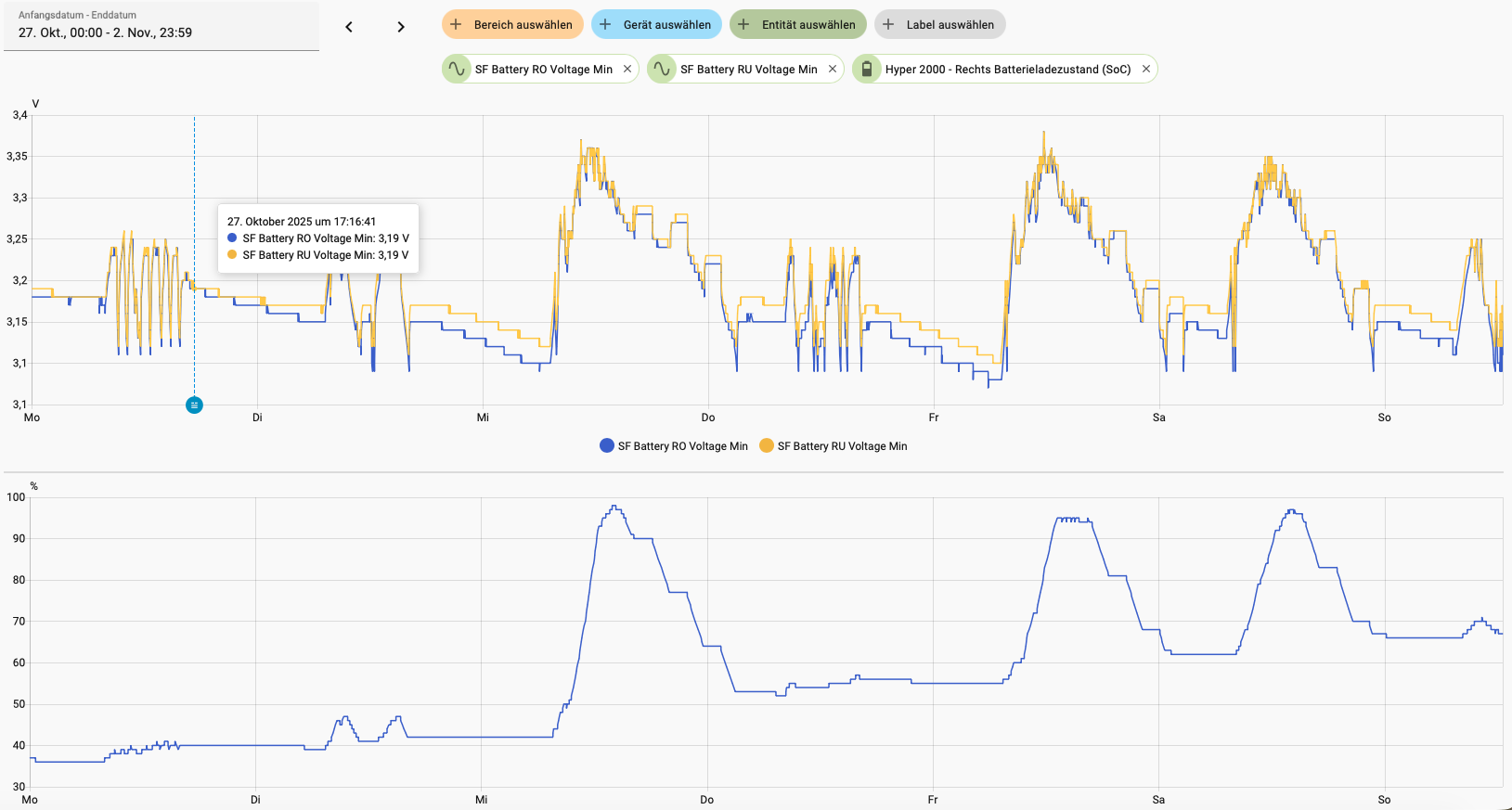 Ich bin (immer wieder) fasziniert zu sehen, wie der SOC waagrecht stehen bleibt, während die Zellspannung, so ganz leicht von 3,18V in Richtung 3,1 V driftet.