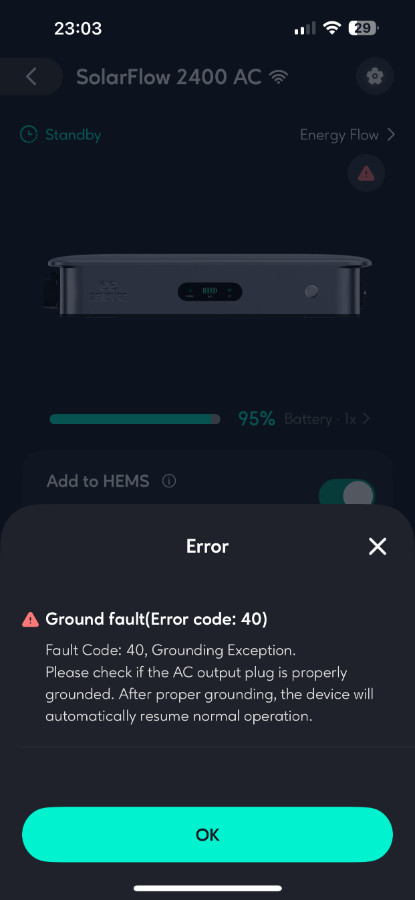 Error code 40 is when the voltage between earth pin and neutral is too high.