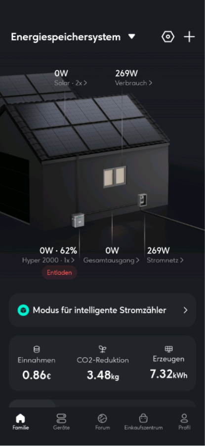 Der Energieverbrauch wird korrekt angezeigt, die Batterie darf bis 10% entladen, der WR ist im CT Modus.