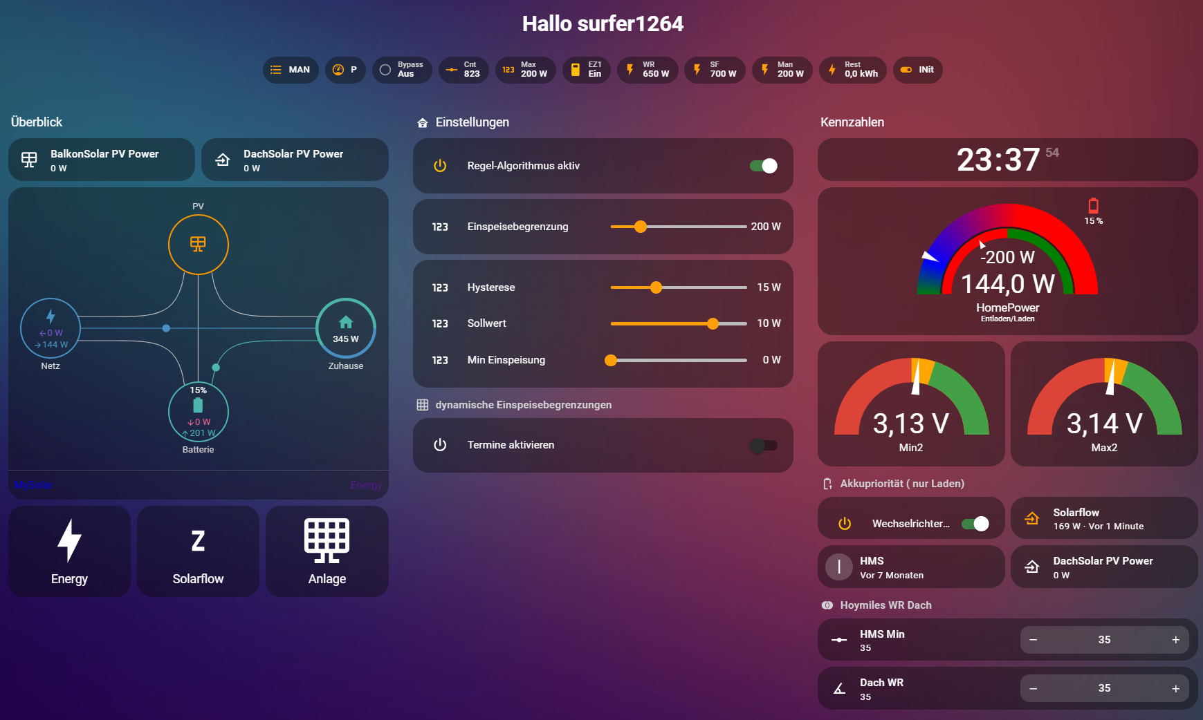 - maximale Einspeisegrenze dynamisch frei wählbar (quasi Akkupriomodus UND Regelung in Kooperation)