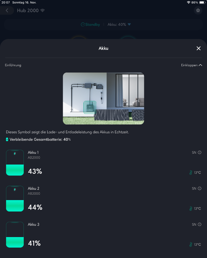 Ich meinte während längerer Zeit, dass ich zur Herstellung einer lokalen Verbindung einen bluetooth proxy brauche. Das flashen des atom lite esp32 klappte dann erst mit einer .yaml, die ChatGpt erstellte, dann aber auf Anhieb. Nach Tagen meinte dann auch ChatGpt, dass die bluetooth Verbindung nur kurz für die mosquito broker Verbindung zum Hub nötig wäre, ein ble proxy sei entbehrlich!, was dann nach mehrmaligem Probieren auch tatsächlich funktionierte. Derzeit sehe ich in der Zendure App keine Batterieangaben mehr und der Hub 2000 schaltet nach Erreichen der unteren Ladegrenze(40%) nicht mehr offline, sondern bleibt im standby. Die Soclevel Entitäten heissen im lokalen Modus anders, ob das der Grund für das Misslingen der Abschaltung ist?? Da momentan sehr wenig PV Leistung anfällt und ich die Batterien nicht zu tief entladen will, schaltete ich den WR ab und warte auf mehr Sonnenschein. Dann schaue ich weiter. Z-HA vers. 1.1.4pre2