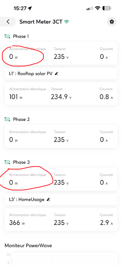 Je n’arrive pas à avoir la consommation dans mes phases pour l’alimentation du 3CT.