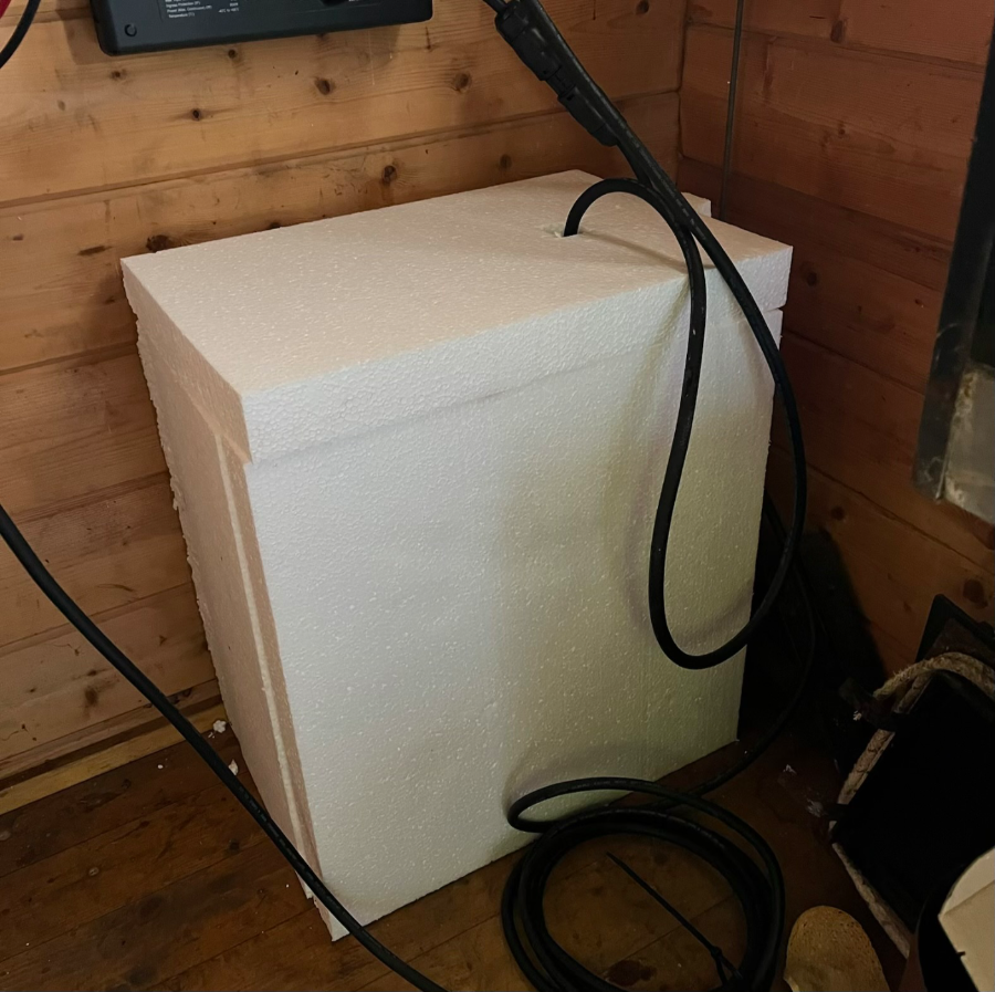Da es ja jetzt draußen wieder etwas kälter wird und der eine oder andere sich fragt was mach ich mit meinen Akkus bei der Kälte. Ich habe meine beiden Akkus , je 1 AB200 und AB1000s in 50mm Dämmplatten vom Baumarkt versteckt. Kosten ca. 8€ für 3 Platten je 100x50cm. Dann könnt ihr euch die Platten auf die Maße 48x45cm für Vorne und Hinten sowie 20x48cm an den Seiten und als Deckel 30x45cm zurecht Schneiden. Unter dem Akku liegt eine dünnere Platte die aber schon von Anfang an da lag. Wer will kann natürlich gerne unten auch eine 30x45cm Platte nehmen. Vielleicht ist das ja für einen von euch interessant.
