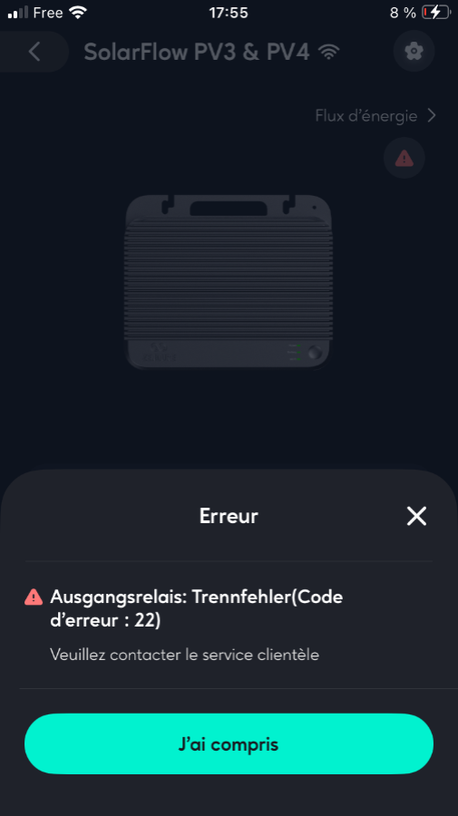 Bonjour, je viens de faire un test, j’ai branché une batterie sur la Solar Flo 800 et ensuite sur le secteur il fonctionne parfaitement. Je l’ai donc remplacé sur l’installation. Puis l’autre sol Flow que j’ai déposé, je l’ai mis également sur juste sur secteur sans batterie. Et là le même problème. Comme si il était en défaut car il n’y avait pas de batterie connecté. Alors que sur l’installation, je veux trois Solar Flow, 800 sans batterie, juste m’en servir comme micro onduleur intelligent. Et ensuite gérer les batteries avec le Solar Flow, 2400, AC. Peut-être un problème de chez Zendure. Ou existe-t-il un adaptateur à mettre à la place de la batterie ?