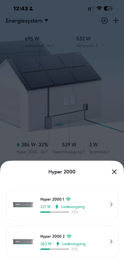 ZenUser6dS619c Hallo, ich besitze 2 x Hyper2000 an der gleichen Phase. Die Sonne scheint mit ca. 400 Watt Solarleistung je Hyper. Der eine entläd zum Hausnetz, Der andere läd mit 300 Watt. Wo ist da der Sinn? Warum arbeiten die nicht synchron? Gruß Frank