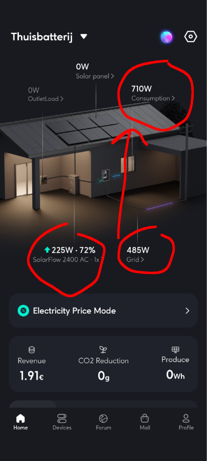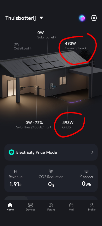 In the app it does not make sense that when I take power from the grid, and when the battery is delivering power because of the max. Power price setting, the app calculates as power consumption the power from the grid+the power from the battery! The consumption amount then is increasing instead of it is decreasing as should be expected. When consumption from grid is 493 watts, and the battery is discharging to my house when the max electricity price is reached, you should expect the consumption goes down by 225 watts which is delivered by the battery, so the consumption would be 228 watts, but surely NOT 710!
