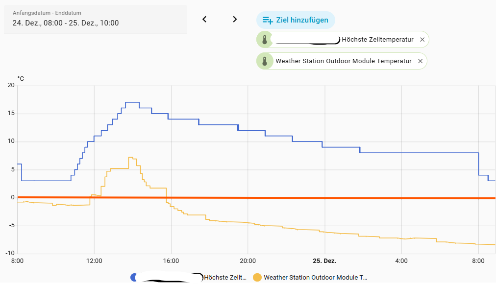 Bild zeigt die Temperaturkurve eines Akkus (eingepackt in einer Thermobox) im Vergleich zur Außentemperatur (ein Netatmo-Sensor). Differenz fast bei 15 Grad (im Betrieb des Akkus).