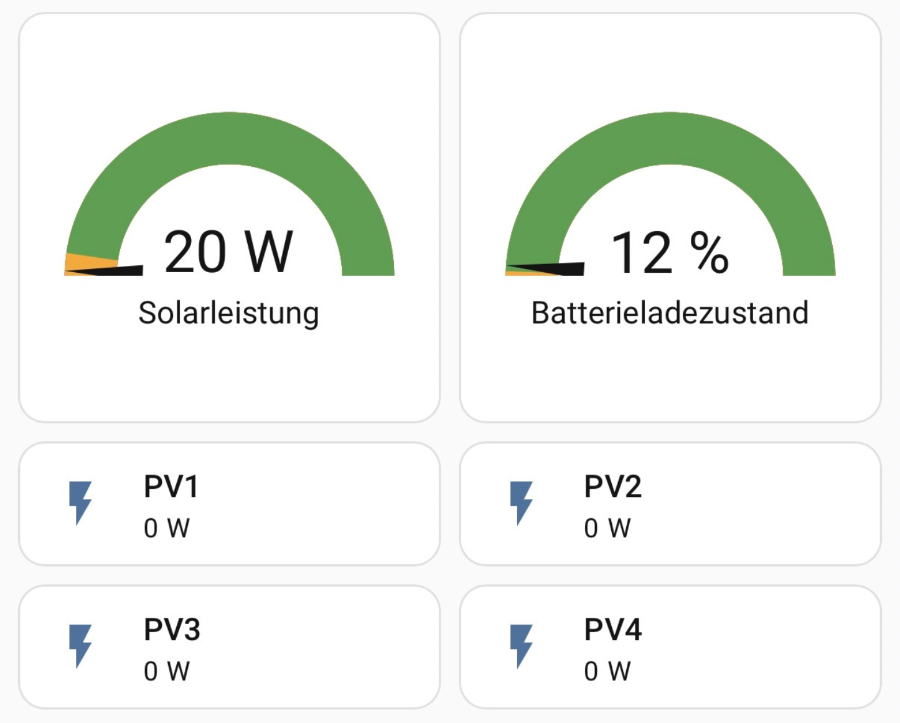 Sowohl in der Zendure App als auch über Home Assistant wird bei mir (morgens) angezeigt, dass ein Solarstrom Gesamt mit meinem SF 800 Pro produziert wird, aber für die Werte der einzelnen Panels wird null geliefert. Rechnerisch produzieren alle 4 Panels grad je 5 Watt (praktisch in meinem Fall zwei null, zwei zehn Watt).