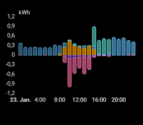 Hier siehst du, wie ein normaler Tag aussieht. Kaum Netzbezug, wenn PV da ist. Überschuss geht in den Speicher.